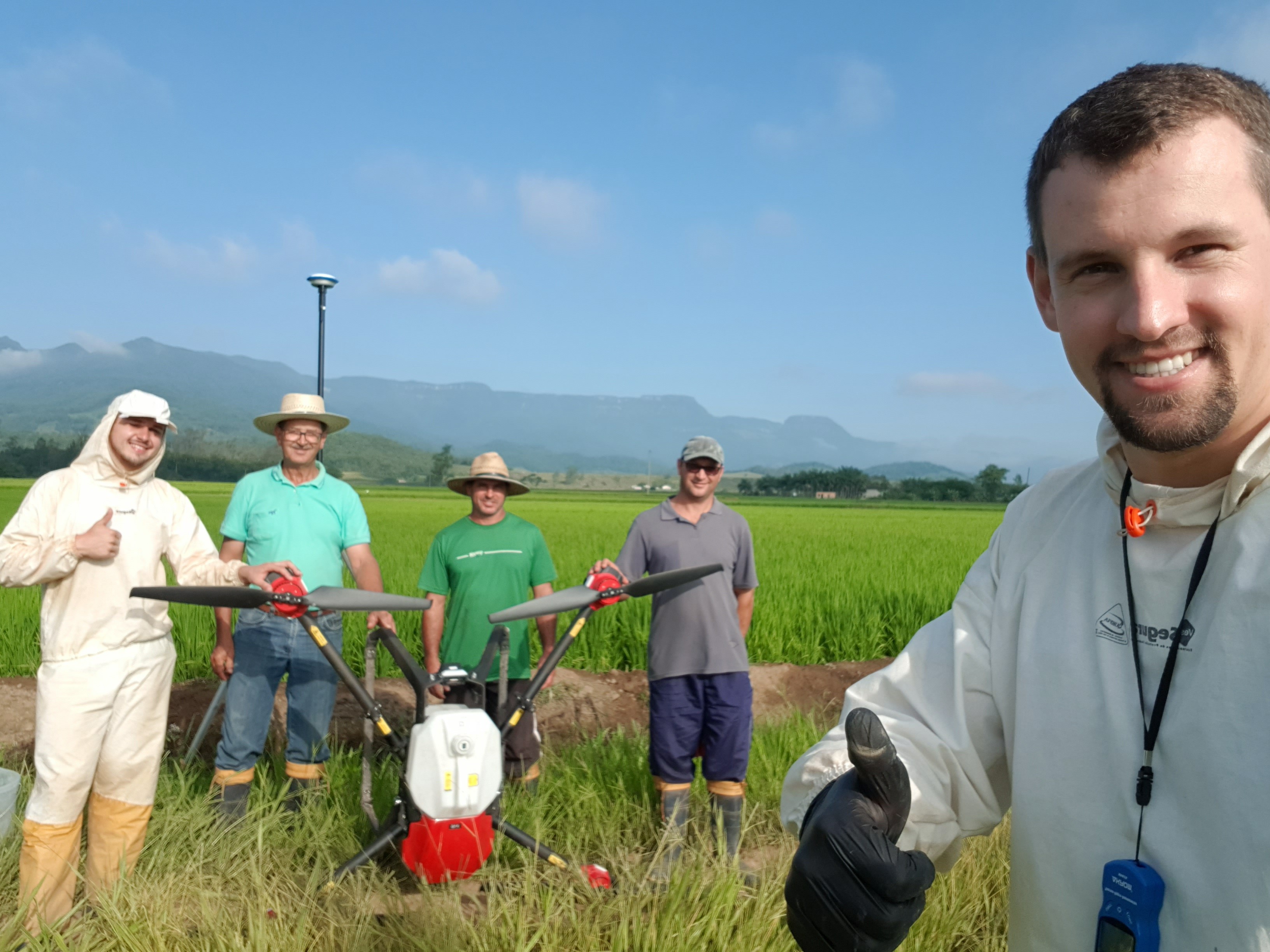 Foi justamente essa experiência que inspirou o casal a empreender — logo após o nascimento da primeira filha — dando início à Campoar com um drone DJI Agras T10, prestando serviços de pulverização em arroz e banana na região.